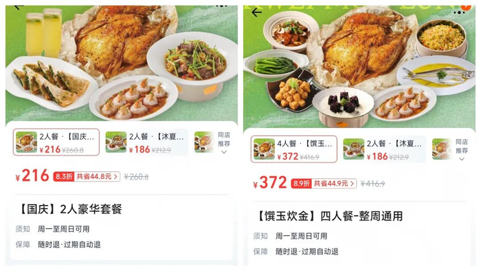 同时AI蓝媒汇还注意到,不同于市场上其他的团购平台,淘宝闪购的到店团购套餐,很大部分,都是可以在国庆期间使用的。上述桂满陇(徐汇万科店)的一款日常4人餐,在淘宝闪购上显示为“整周通用”,而在其他平台,则明确表明,在国庆期间不可用。