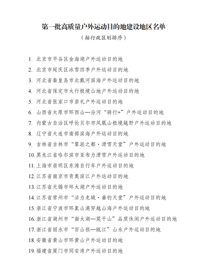 央视网消息:近日,国家发展改革委、体育总局、自然资源部、住房城乡建设部、水利部、国家林草局等部门印发了《关于印发第一批高质量户外运动目的地建设地区名单的通知》(发改办社会〔2025〕908号,以下简称《通知》),确定将“北京市平谷区金海湖户外运动目的地”等49个目的地纳入高质量户外运动目的地建设地区名单予以重点支持。